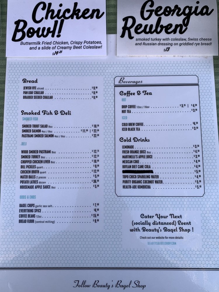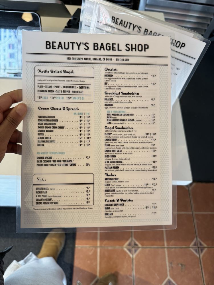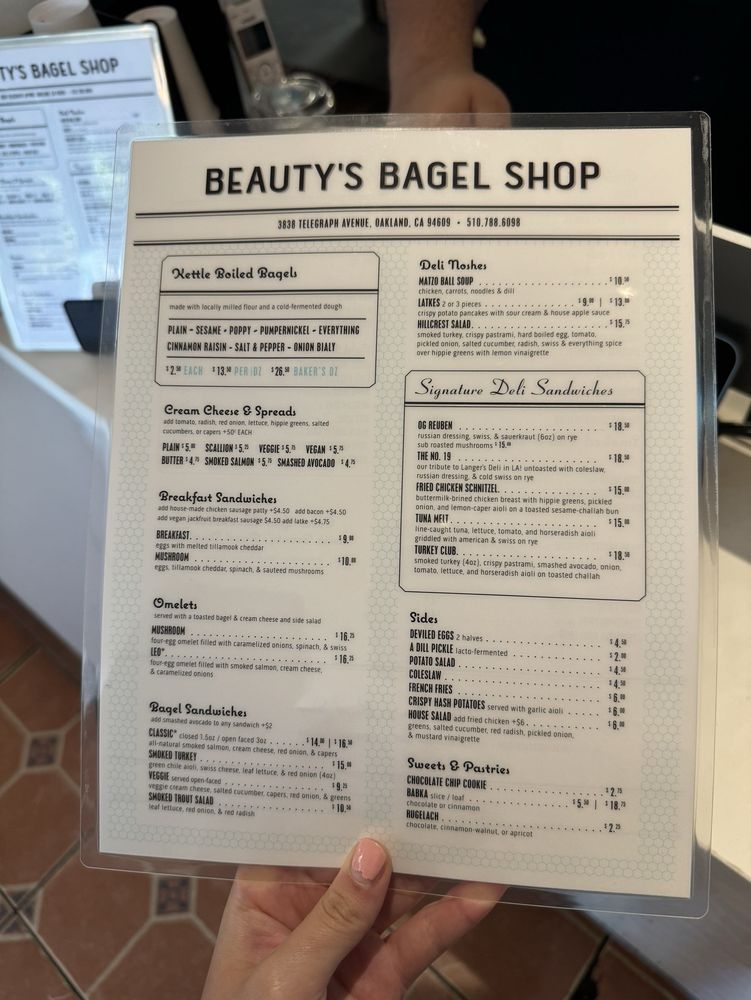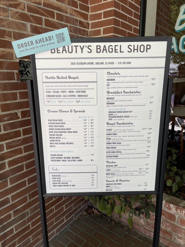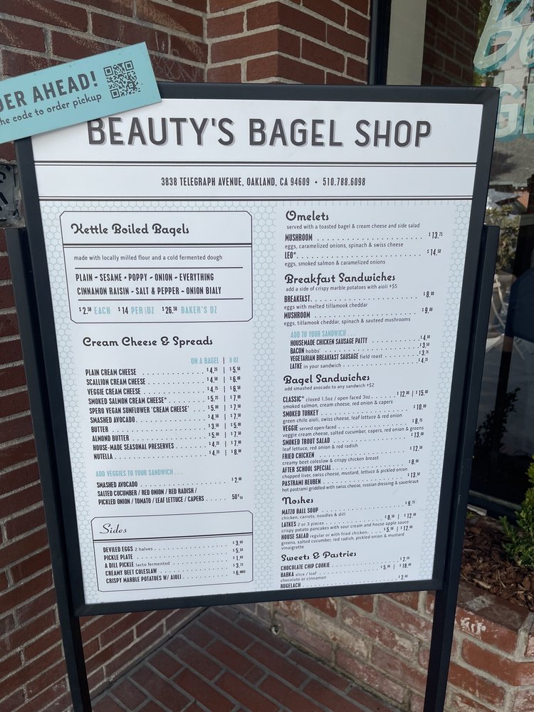 Beauty’s Bagel Shop, located in Oakland, CA, offers a variety of bagels, breakfast, and brunch options. The menu includes popular items like the Seasonal Salad, Breakfast Sandwich, Smoked Trout Salad, Pickle Plate, and House Granola. Customers have praised the quality of the bagels and the friendly service. With options for vegan and vegetarian dishes, Beauty’s Bagel Shop caters to a diverse clientele. The bagels are Montreal style, known for their thinner texture compared to New York style bagels. The restaurant offers outdoor seating, waiter service, and accepts various payment methods, including credit cards and cryptocurrency. If you're in the mood for a delightful bagel experience with a welcoming atmosphere, Beauty’s Bagel Shop is the place to visit.